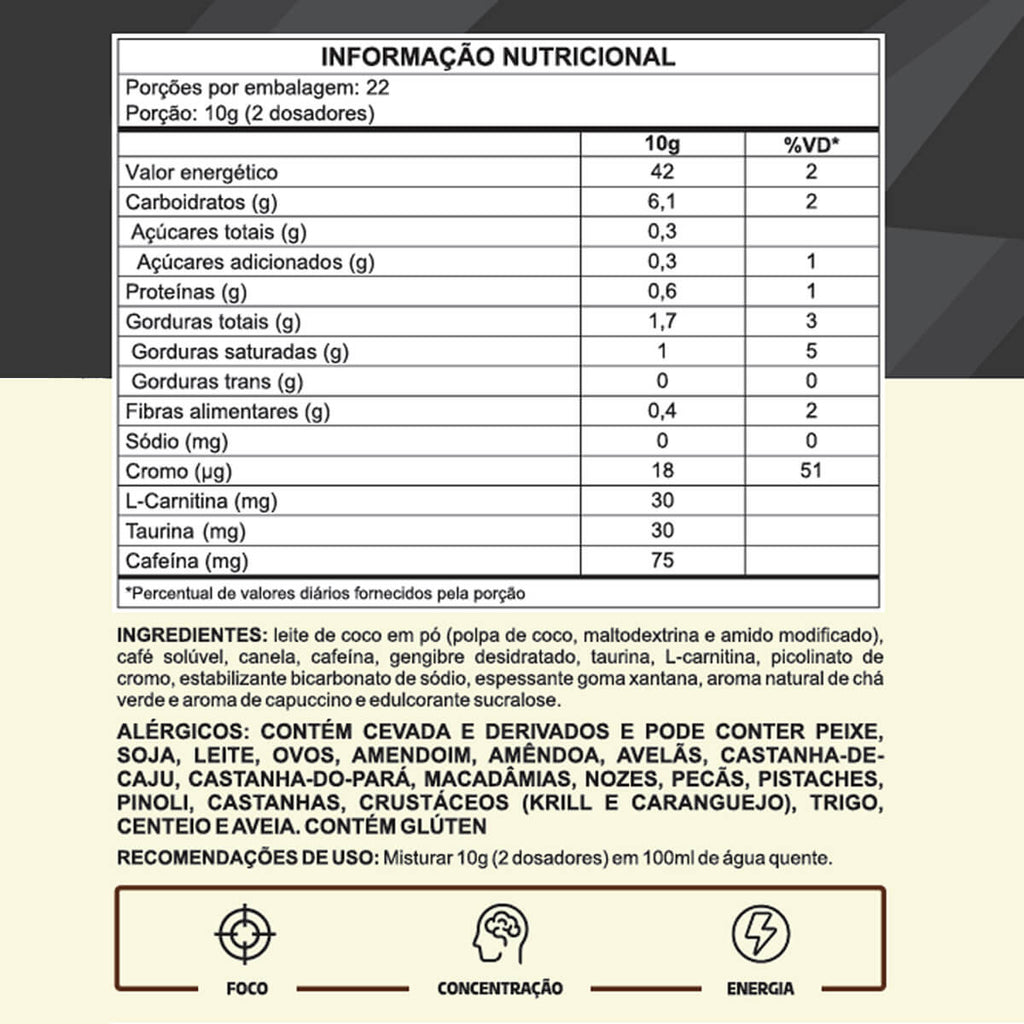 O Turbo Coffee oferece uma fórmula premium com ingredientes cuidadosamente selecionados, como gengibre, taurina, canela, L-carnitina, cafeína e picolinato de cromo, proporcionando um impulso de energia, foco e concentração. Sua versatilidade permite ser servido tanto quente quanto frio, adaptando-se às preferências individuais. Com zero lactose e um sabor delicioso de Chocolate Belga, cada dose oferece uma experiência revigorante e nutritiva para o seu dia.